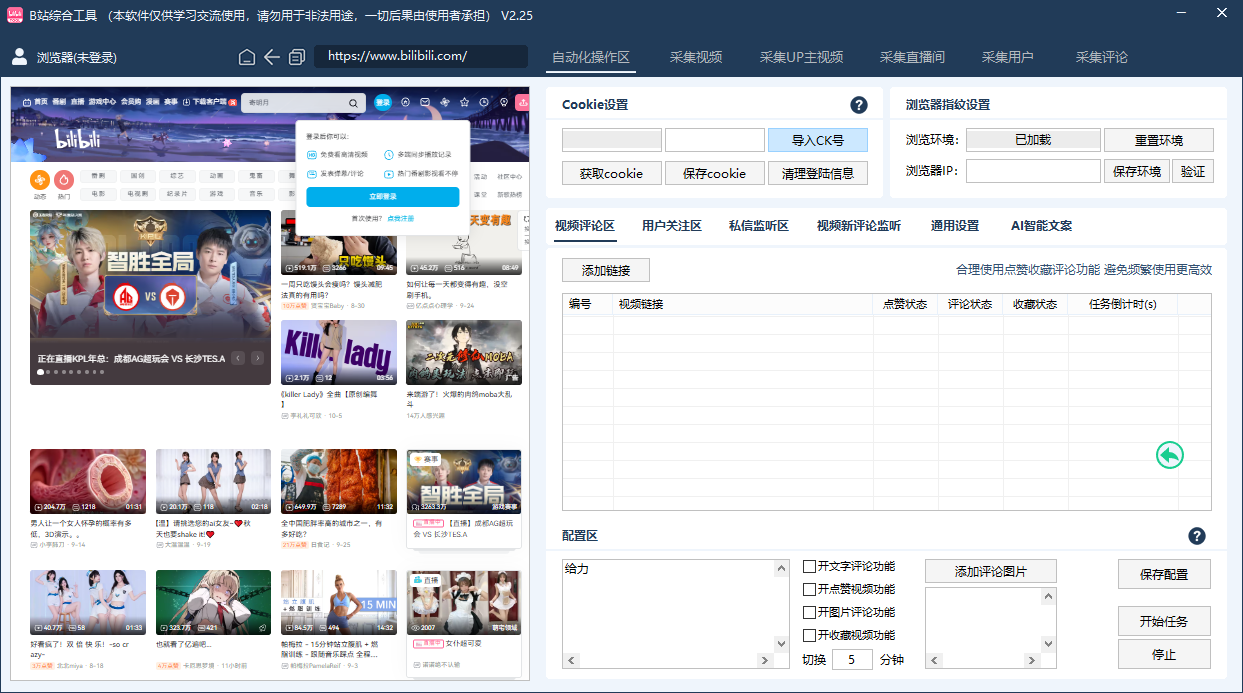 可批量搜索关键字采集视频或UP主的主页视频,批量采集视频评论等多种截留采集功能。将采集到的笔记链接或评论用户id自动一键导入自动化操作区进行视频批量关注私信评论点赞收藏。可关键词自动回复私信内容,视频新评论监控等多种采集获客截留功能为一体的B站引流神器。