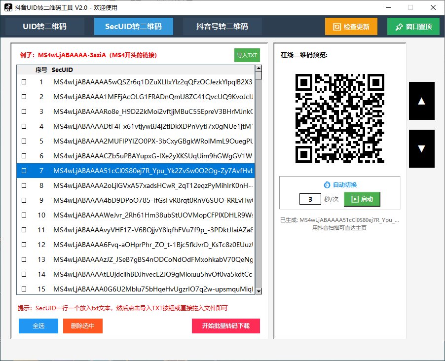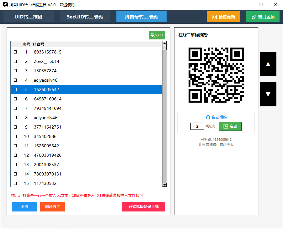 抖音uid批量转二维码永久卡 🤖 自动发货 ¥ 10.00 购买数量 优惠券 【更换】 使用 已优惠金额:0.00元 联系方式 选择支付方式 推荐支付宝支付 支付宝备用支付通道1 余额支付 抖音app扫码直接跳转用户主页 实时显示二维码 新增功能定时自动跳转